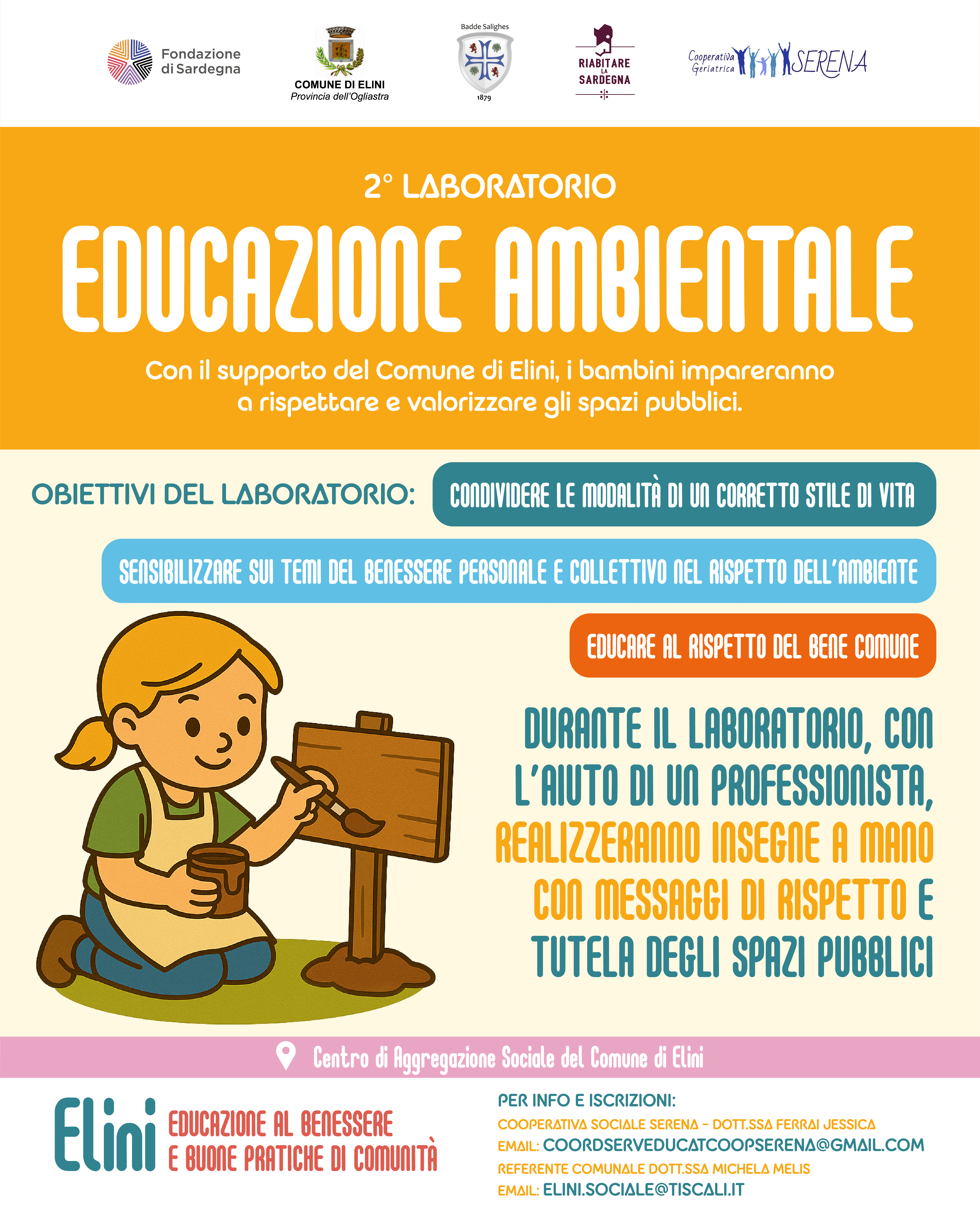 Avvisi - Politiche Sociali, Famiglia e ScuolaSabato 11 Ottobre 2025 quarto appuntamento del Progetto "Elini: educazione al benessere e buone pratiche di comunità" rivolto ai minori dai 6 agli 11 anni che frequentano la Scuola Primaria con il Laboratorio "Educazione Ambientale".