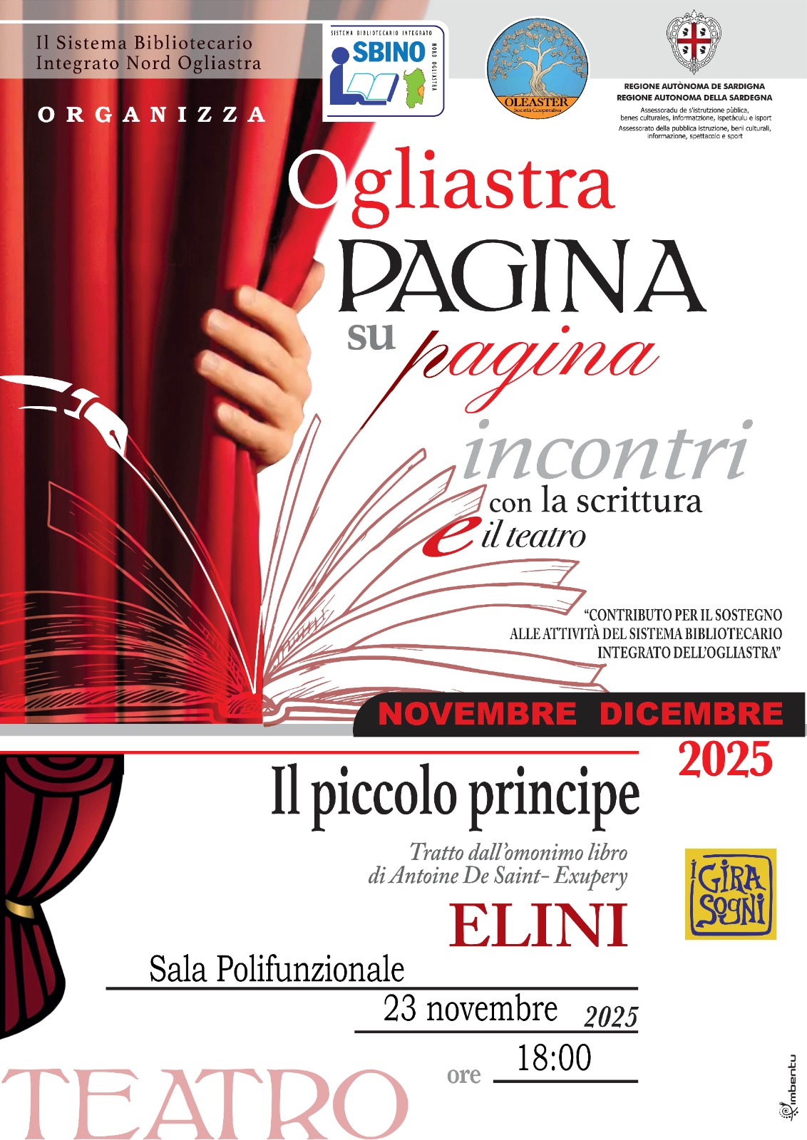 Spettacolo teatrale "Il Piccolo Principe" tratto dall'omonimo romanzo. Elini, domenica 23 Novembre 2025 ore 18.00 - Sala Polifunzionale. Consultare locandina allegata.17 Nov 2025Avvisi - Dal Comune