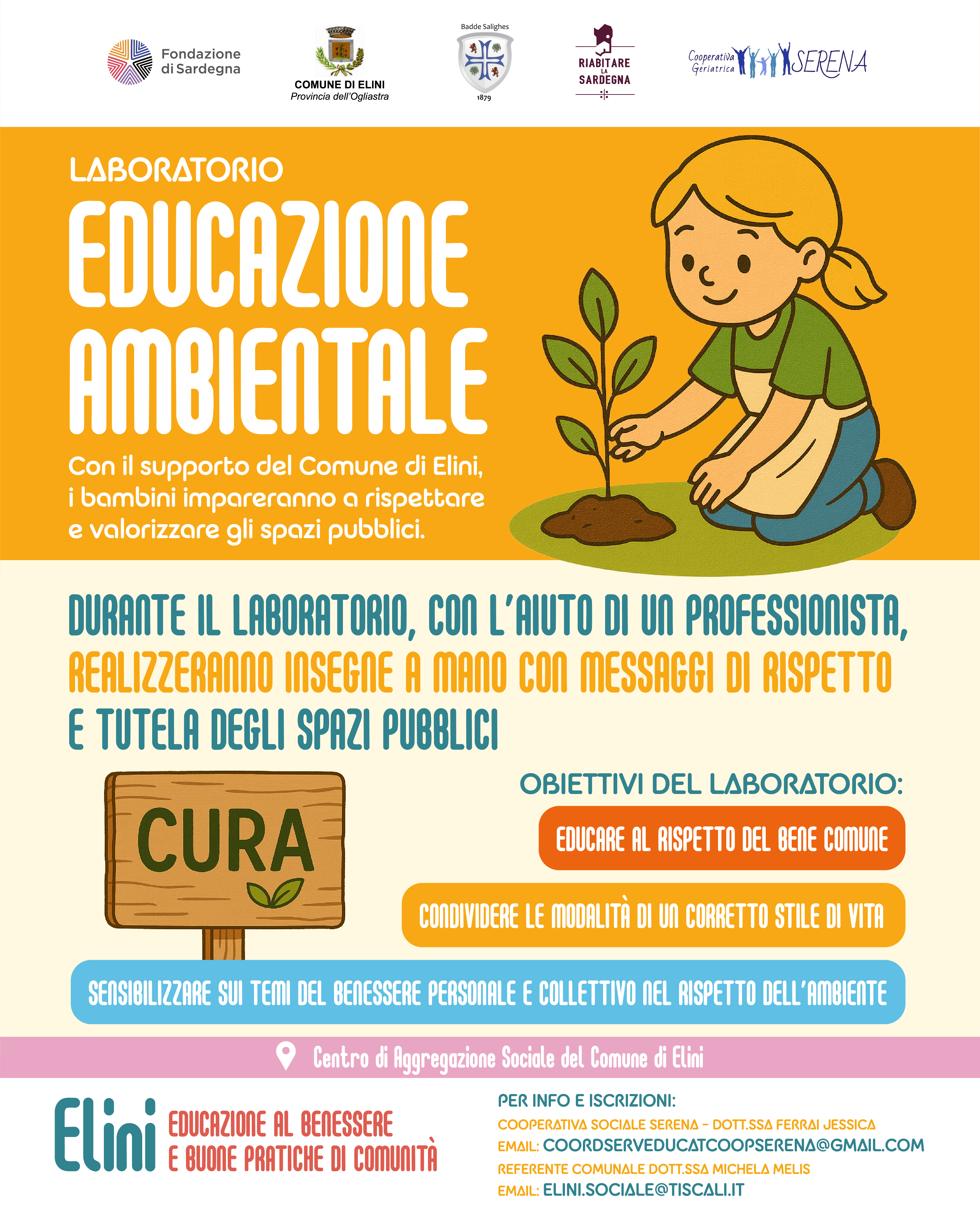 Avvisi - Politiche Sociali, Famiglia e ScuolaSabato 27 Settembre 2025 secondo appuntamento del Progetto "Elini: educazione al benessere e buone pratiche di comunità" rivolto ai minori dai 6 agli 11 anni che frequentano la Scuola Primaria con il Laboratorio "Educazione Ambientale".