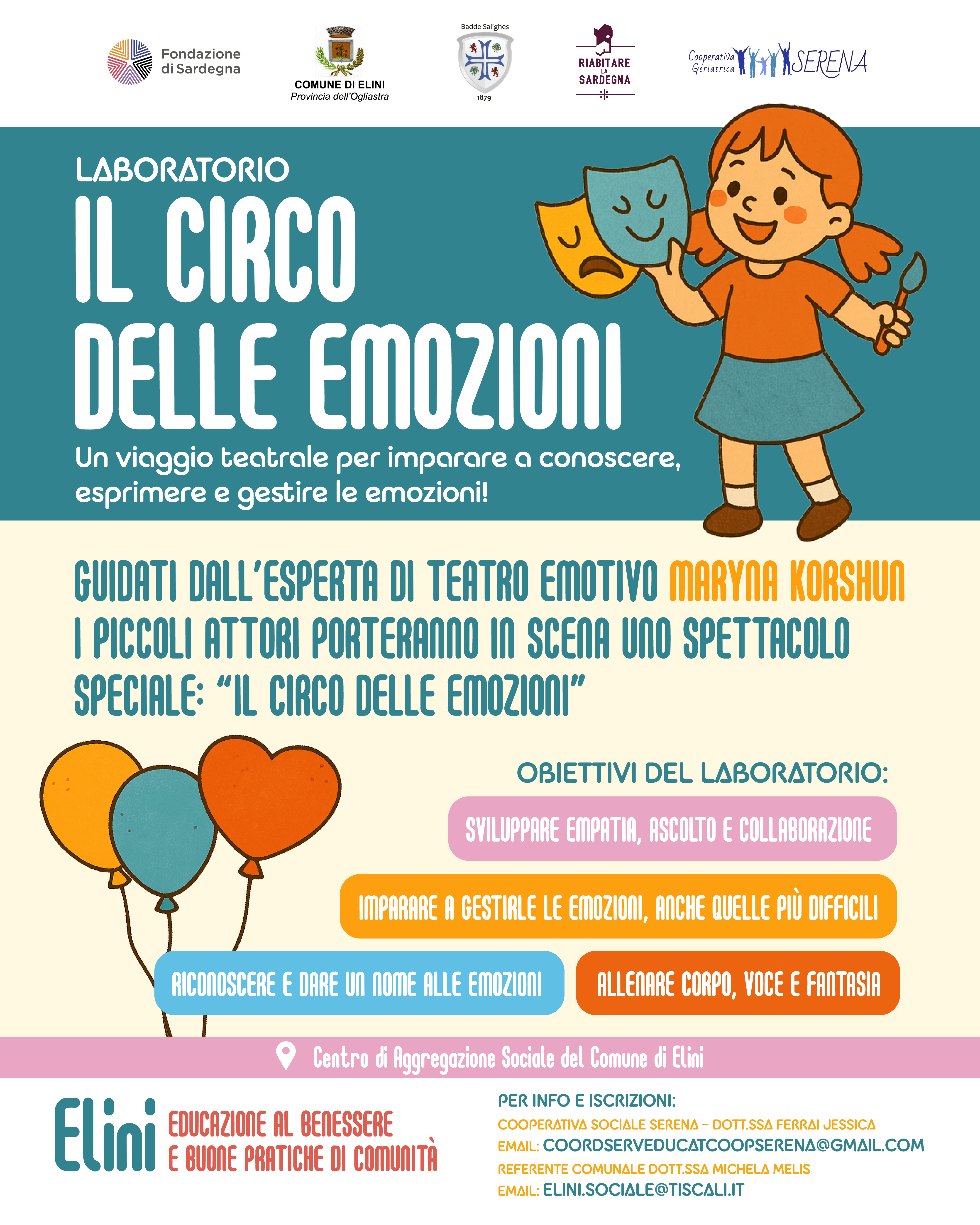 Avvisi - Politiche Sociali, Famiglia e ScuolaSabato 20 Settembre 2025 primo appuntamento del Progetto "Elini: educazione al benessere e buone pratiche di comunità" rivolto ai minori dai 6 agli 11 anni che frequentano la Scuola Primaria con il Laboratorio "Il Circo delle Emozioni".
