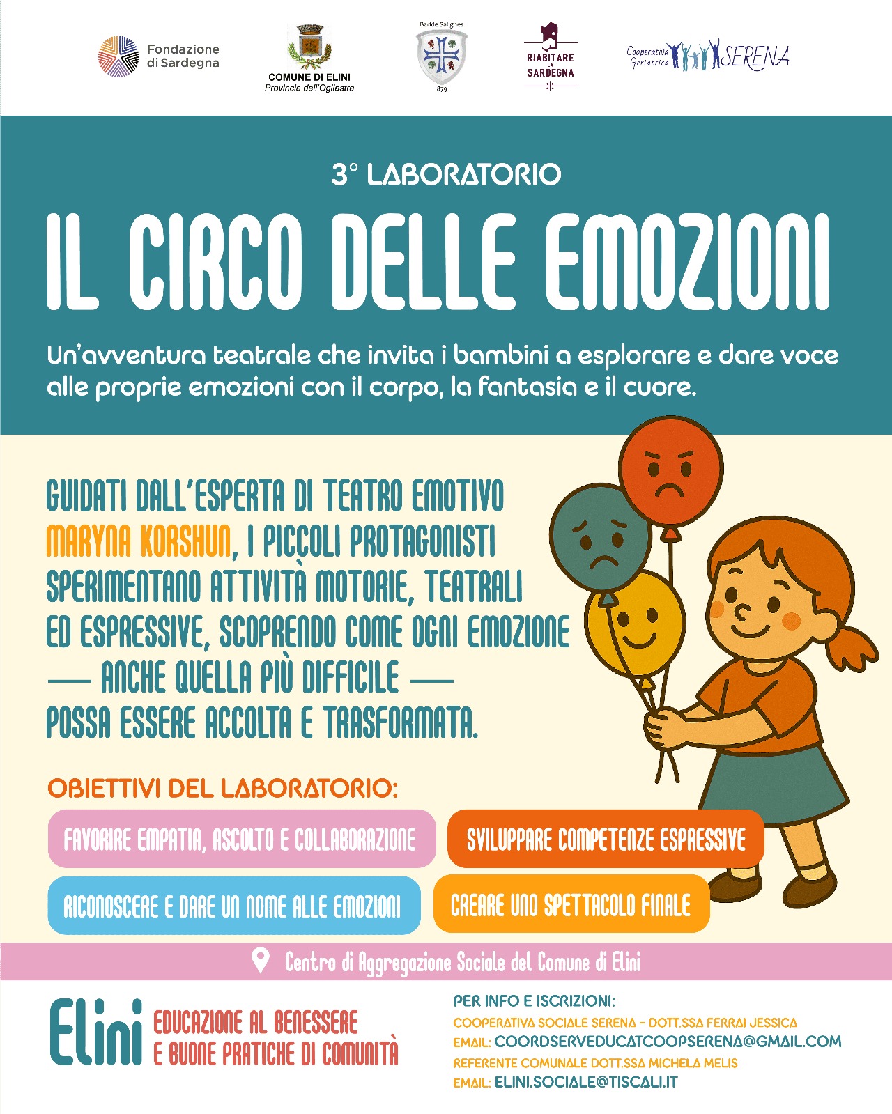 AvvisiSabato 18 Ottobre 2025 quinto appuntamento del Progetto "Elini: educazione al benessere e buone pratiche di comunità" rivolto ai minori dai 6 agli 11 anni che frequentano la Scuola Primaria con il Laboratorio "Il Circo delle Emozioni".