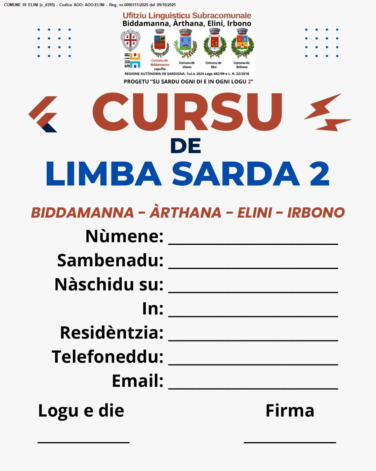 Progetto lingua sarda "Su sardu ogna die e in ognu logu 2": Apertura iscrizioni al corso. Consultare avviso, programma e modulo iscrizione allegati. Scadenza presentazione domande 13 OTTOBRE 202509 Ott 2025Avvisi - Dal Comune